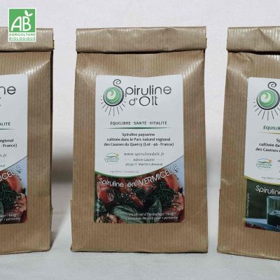 La spiruline en vermicelle, ou en paillette, est le produit brut qui n’a subi aucune transformation après le séchage. À utiliser tel quel sur vos salades, crudités, votre assiette préalablement tiédit, dans un yaourt ou mélangé à une pâte à tartiner.